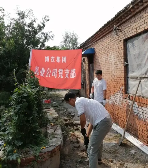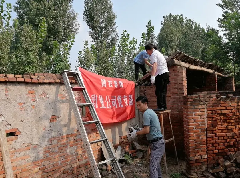 貧困戶魏澤美家是博農乳業公司對口扶貧幫扶戶,公司黨支部了解到魏澤美家中廁所年久失修,給其生活造成不便的實際情況,經過研究,決定發揮公司支部黨員水電、建筑等人才優勢,組織黨員直接參與其廁所整修工作。30日下午,乳業公司黨員12人克服天氣炎熱、工作環境條件復雜的多重困難,全身心投入到廁所整修工作中,有的撤除房頂,有的焊接梁架,有的開挖水溝,有的連接電路,用整整一下午時間,完成了房頂撤除更換、連通水電的任務,幫扶工作受到貧困戶魏澤美的交口稱贊。